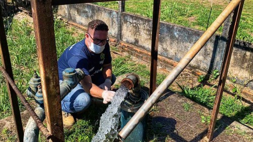 A equipe técnica realiza os trabalhos de reconhecimento e de análise da área operacional do atual sistema, além de estudos técnicos e análise físico-química e microbiológica da água do município e, também, das estruturas dos poços de captação e reservatórios.