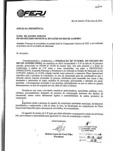 A Federação de Futebol do Estado do Rio de Janeiro (Ferj) solicitou ao secretário de saúde do município, Daniel Soranz, a autorização para cada clube levar 80 convidados para a final do Carioca, sábado, no Maracanã, entre Flamengo e Fluminense. A prefeitura não autorizou.