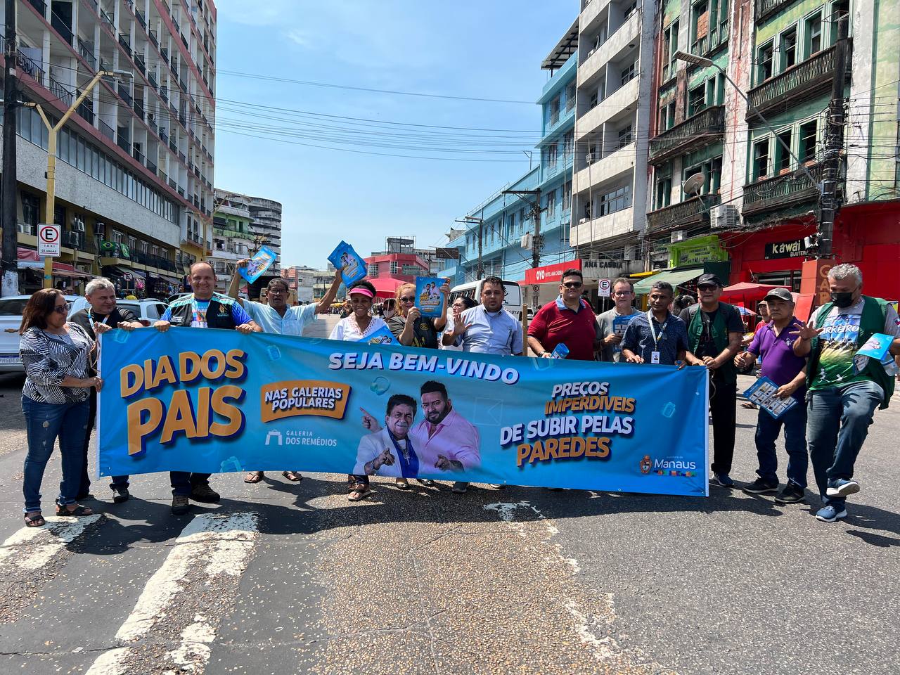 Com a proximidade do Dia dos Pais, os permissionários da galeria Espírito Santo, rua Joaquim Sarmento, esquina com a 24 de Maio, e galeria dos Remédios, rua Miranda Leão, com entrada também pela Marquês de Santa Cruz, no Centro, promoveram, na manhã desta sexta-feira, 12/8, uma grande panfletagem na avenida Floriano Peixoto, praça da Matriz e praça Tenreiro Aranha, para chamar a atenção e atrair os consumidores para os espaços. Os permissionários do shopping Phelippe Daou realizaram panfletagem em frente ao centro de compras, na avenida Camapuã, zona Norte. A Prefeitura de Manaus, por meio da Secretaria Municipal de Agricultura, Abastecimento, Centro e Comércio Informal (Semacc), pasta que coordena os centros de compras, deu apoio às ações.