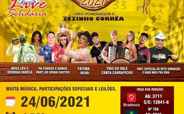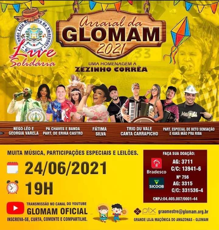 Em 2021, mais uma vez, o tradicional Arraial da Grande Loja Maçônica do Amazonas (GLOMAM) será realizado em forma de Live. Como em todos os anos, o evento ocorre dando enfoque a uma ação solidária e, neste ano, o objetivo principal é a arrecadação de doações às vítimas da enchente no Amazonas, que já atingiu a marca histórica de 2012. Também será realizada homenagem ao cantor Zezinho Correa, principal atração do arraial solidário de 2020 e que, infelizmente, veio a falecer, vítima de Covid-19, em fevereiro deste ano.