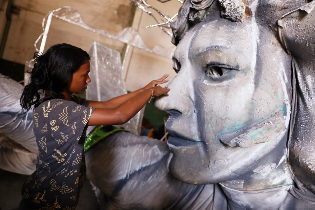 “Nós estamos muito felizes, eu sei que está bem reduzido, mas acho que deu para gente tirar um pouco esse pensamento de pandemia. Deu para ajudar um pouco meu pessoal que está aqui trabalhando comigo”, afirma a artista da Mocidade Independente de Aparecida. “A gente gosta disso, eu gosto desse galpão. No Carnaval, eu me mudo, eu vivo aqui com meu esposo, a gente vive nossa vida aqui durante dois meses. Então, a nossa vida é isso, é a arte”, destaca Bel Costa.