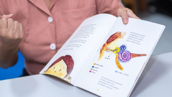 “Foi quando eu pensei que um livro com uma proposta lúdica, com ilustrações e linguagem simples, ia facilitar a compreensão de todos os que cercam essa criança. As pessoas não conhecem como funciona a orelha humana em si, a gente se fixa muito na parte externa. E à medida que eu mostro de uma maneira mais lúdica sobre como funciona esse sistema auditivo, abordando esse universo dos sons, explicando como eles são processados em um sistema mais alto das habilidades complexas, todos passam a cooperar nessa reabilitação”, explica Mariana Pedrett.