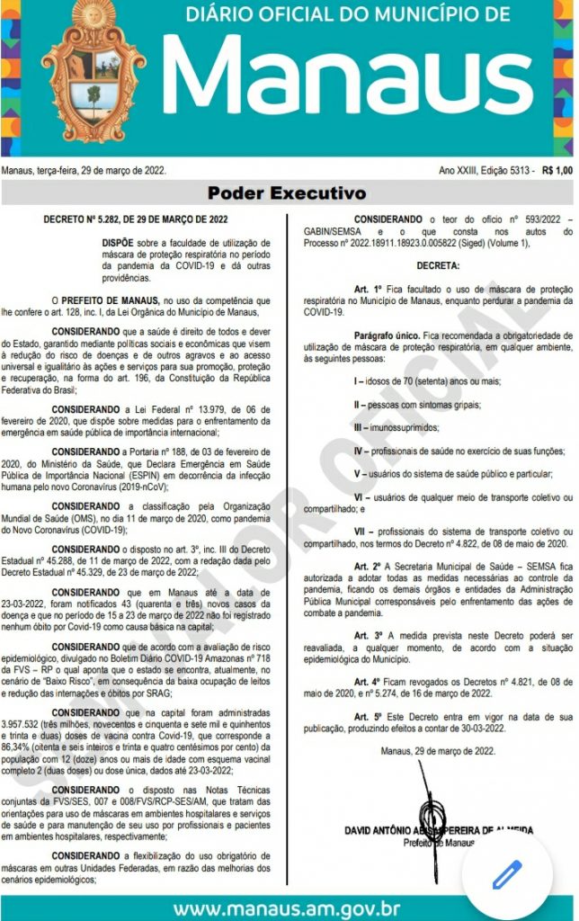 A edição nº 5.313, do Diário Oficial do Município (DOM), desta terça-feira, 29/3, traz o decreto municipal, nº5.282 assinado pelo prefeito de Manaus, David Almeida, que flexibiliza o uso da máscara de proteção na capital em locais fechados, além de estabelecer algumas recomendações para a utilização da peça em determinados espaços. Ainda conforme o decreto, as medidas nele previstas poderão ser reavaliadas a qualquer momento, de acordo com a situação epidemiológica do município.