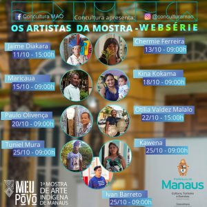Uma websérie produzida pela Prefeitura de Manaus, por meio do Conselho Municipal de Cultura (Concultura), com o apoio da Fundação Municipal de Cultura, Turismo e Eventos (Manauscult), apresenta ao público, desde o último dia 11 até 25/10, como parte das comemorações do aniversário de 352 anos de Manaus, os artistas indígenas que participam da 1ª Mostra de Arte Indígena, exibida nas redes sociais.