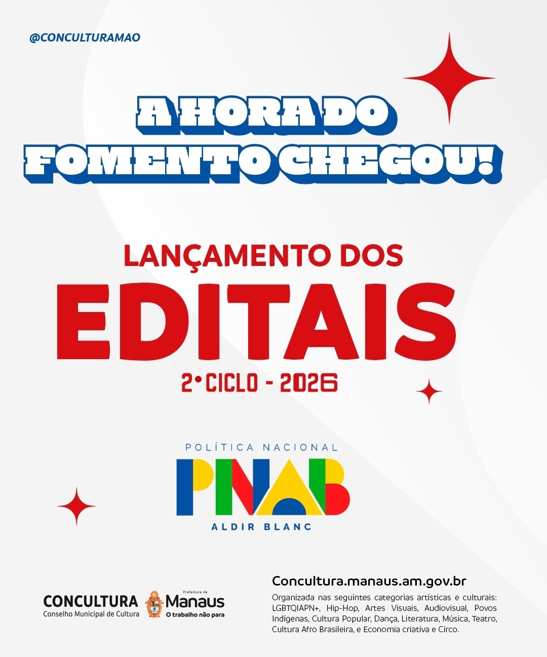 A Prefeitura Municipal de Manaus, por meio do Conselho Municipal de Cultura (CONCULTURA) tornará público, no dia 23 de janeiro, às 18h, no estacionamento do Mirante Lúcia Almeida, os editais da Política Nacional Aldir Blanc – PNAB 2026.