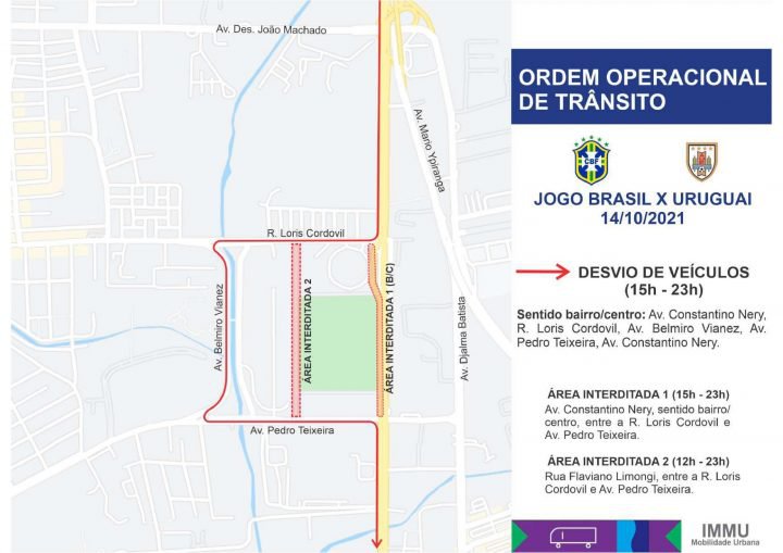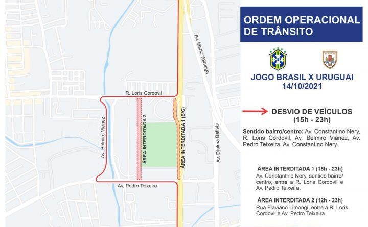 A Prefeitura de Manaus, por meio do Instituto Municipal de Mobilidade Urbana (IMMU), irá interditar a partir das 6h, desta quinta-feira, 14/10, a rua Flaviano Limongi, que fica ao lado da Arena da Amazônia, no trecho entre as avenidas Pedro Teixeira e Lóris Cordovil, zona Centro-Oeste. Somente as delegações e viaturas de serviços poderão ter acesso ao local. A medida é necessária para garantir a fluidez das viaturas de segurança e das seleções brasileira e uruguaia, que disputam a 12ª rodada das Eliminatórias para a Copa do Mundo de 2022.